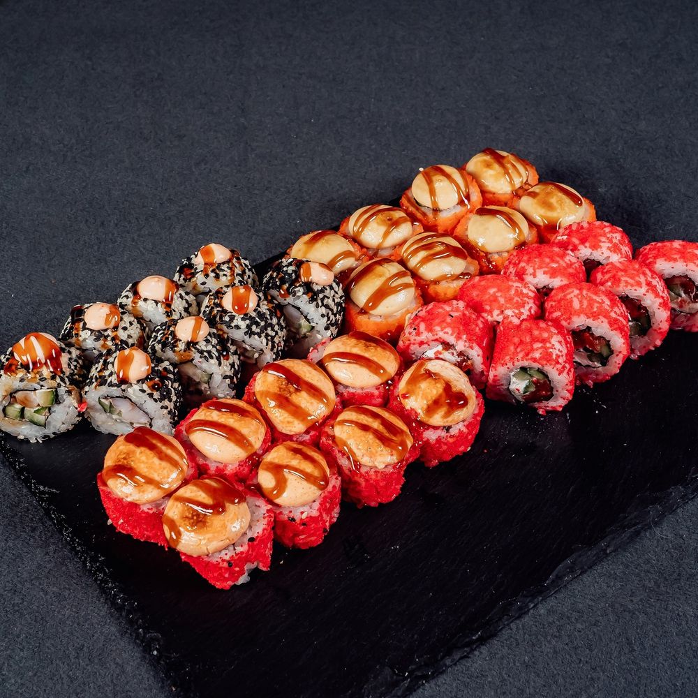 ролл Филадельфия запеченая креветка, ролл Калифорния запеченая масага, ролл Калифорния с лососем, ролл спайси угорь