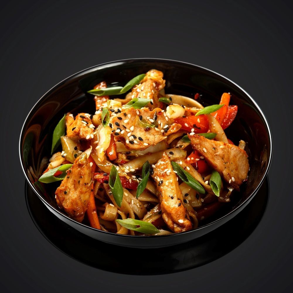 лапша удон, микс овощей, соевый соус, куриное филе, соус терияки, кунжут
