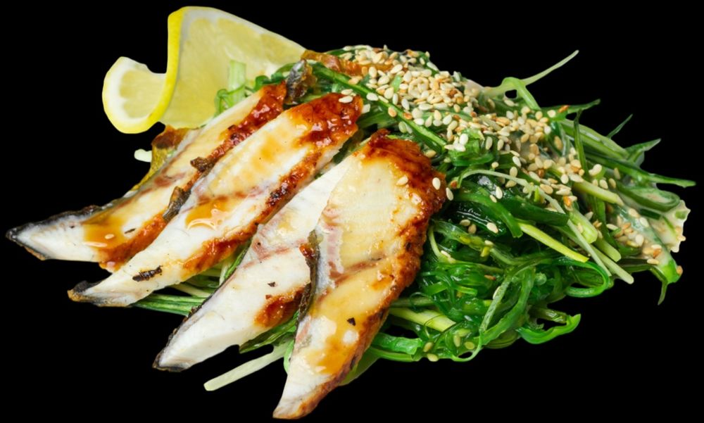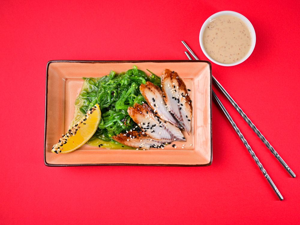 салат чука, соус ореховый, угорь, кунжут