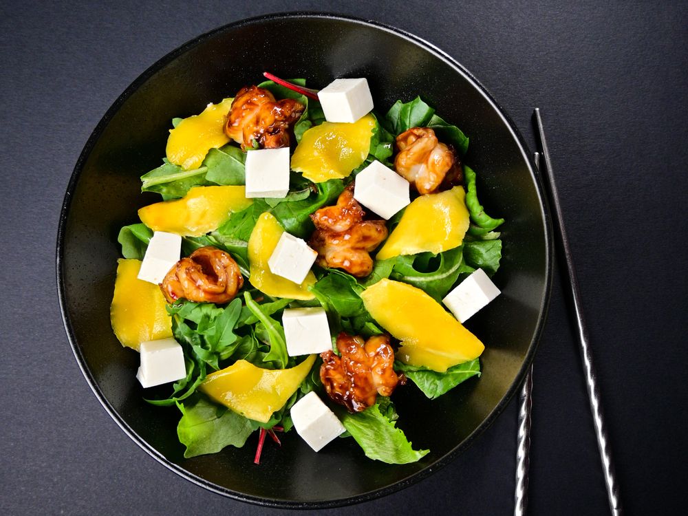 креветки, микс салата, сыр фета, манго