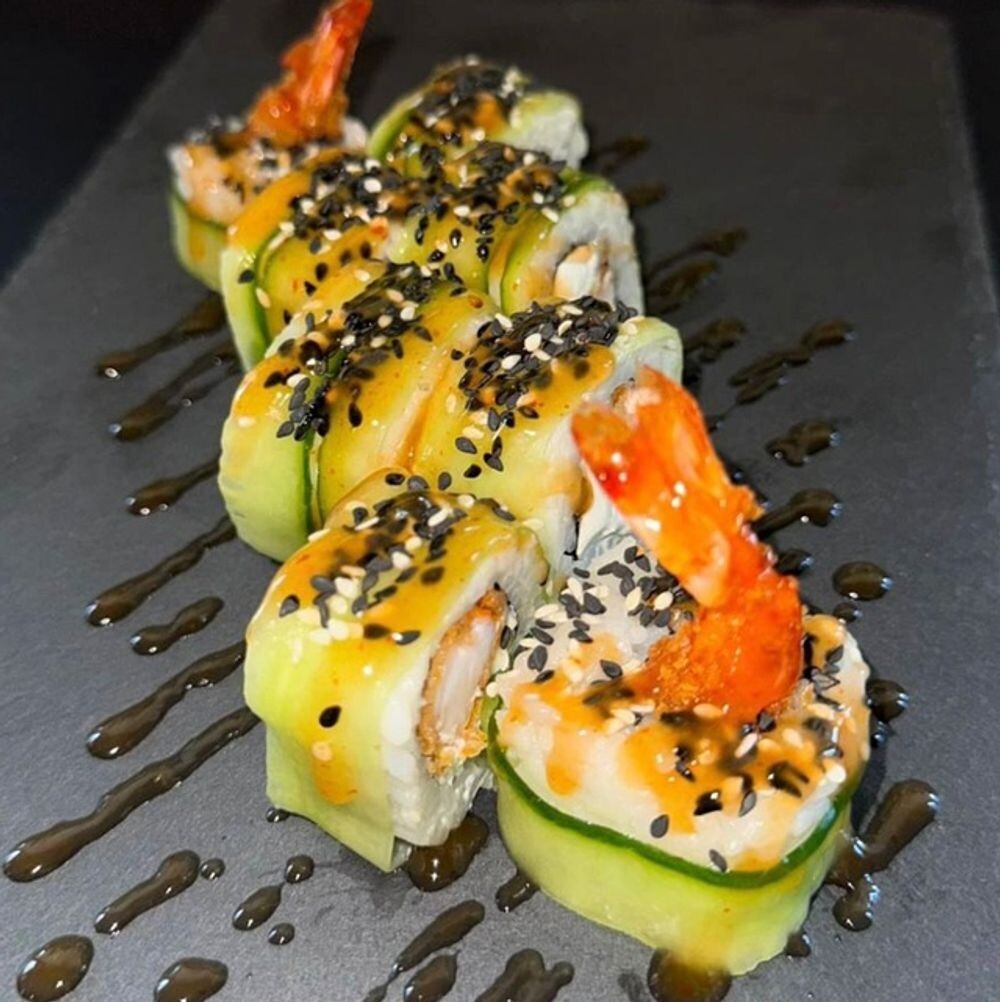 рис, сыр Кремете, нори, креветки темпура, огурец, соус манго чили, кунжут