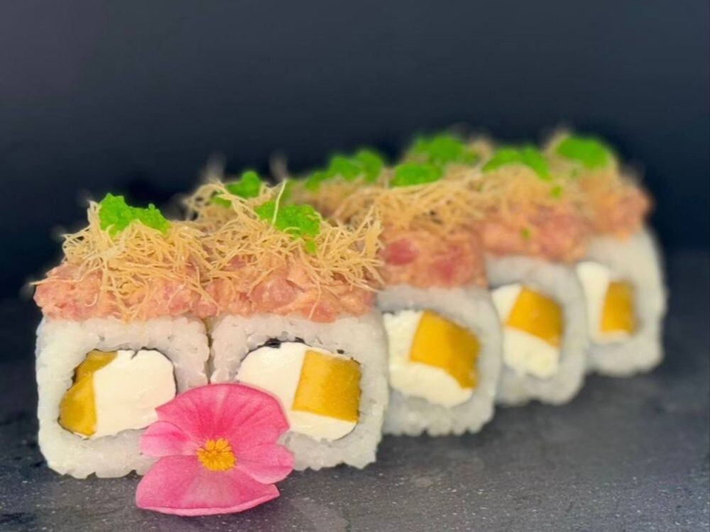 рис, сыр Кремете, нори, тунец, майонез, тесто Катаифи, икра масага, манго