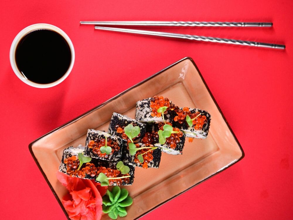 Рис, нори, сыр кремете, огурец, угорь, икра масаго черная, икра