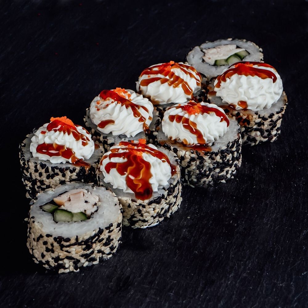 рис, нори, сыр Кремете, куриное филе, огурец, икра масага, кунжут